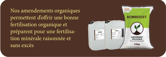 Nos amendements organiques permettent d’offrir une bonne fertilisation organique et préparent pour une fertilisation minérale raisonnée et sans excès